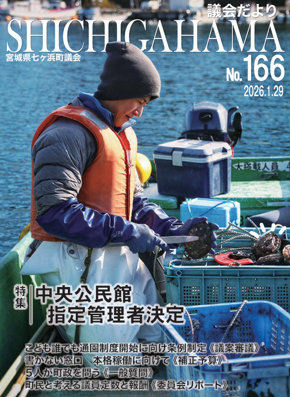 # 議会 しちがはま議会だより しちがはま議会だより最新号 過去の議会だよりバックナンバー しちがはま議会だより最新号 しちがはま議会だより第166号(令和8年1月29日).pdf 過去の議会だよりバックナンバー しちがはま議会だより第165号(令和7年10月30日).pdf しちがはま議会だより第164号(令和7年7月31日発行).pdf しちがはま議会だより第163号(令和7年4月24日発行).pdf しちがはま議会だより第162号(令和7年1月30日発行).pdf しちがはま議会だより第161号(令和6年10月31日発行).pdf しちがはま議会だより第160号(令和6年8月1日発行).pdf しちがはま議会だより第159号(令和6年4月25日発行).pdf しちがはま議会だより第158号(令和6年2月1日発行).pdf しちがはま議会だより第157号(令和5年11月発行).pdf しちがはま議会だより初議会特別号(令和5年9月発行).pdf しちがはま議会だより第156号(令和5年8月発行) しちがはま議会だより第155号(令和5年4月発行) しちがはま議会だより第154号(令和5年2月発行) しちがはま議会だより第153号(令和4年9月発行) しちがはま議会だより第152号(令和4年8月発行) しちがはま議会だより第151号(令和4年4月発行). しちがはま議会だより第150号(令和4年2月発行) しちがはま議会だより第149号(令和3年11月発行) しちがはま議会だより第148号(令和3年7月発行) しちがはま議会だより第147号(令和3年4月発行) しちがはま議会だより第146号(令和3年1月発行) しちがはま議会だより第145号(令和2年10月発行) しちがはま議会だより第144号(令和2年7月発行) しちがはま議会だより第143号(令和2年5月発行) しちがはま議会だより第142号(令和2年1月発行) しちがはま議会だより第141号(令和元年11月発行) しちがはま議会だより初議会特別号(令和元年10月発行) しちがはま議会だより第140号(令和元年7月発行) しちがはま議会だより第139号(平成31年4月発行) しちがはま議会だより第138号(平成31年1月発行) しちがはま議会だより第137号(平成30年11月発行) しちがはま議会だより第136号(平成30年7月発行) しちがはま議会だより第135号(平成30年5月発行) この件に関する問合せ 議会事務局(電話:022-357-7435)