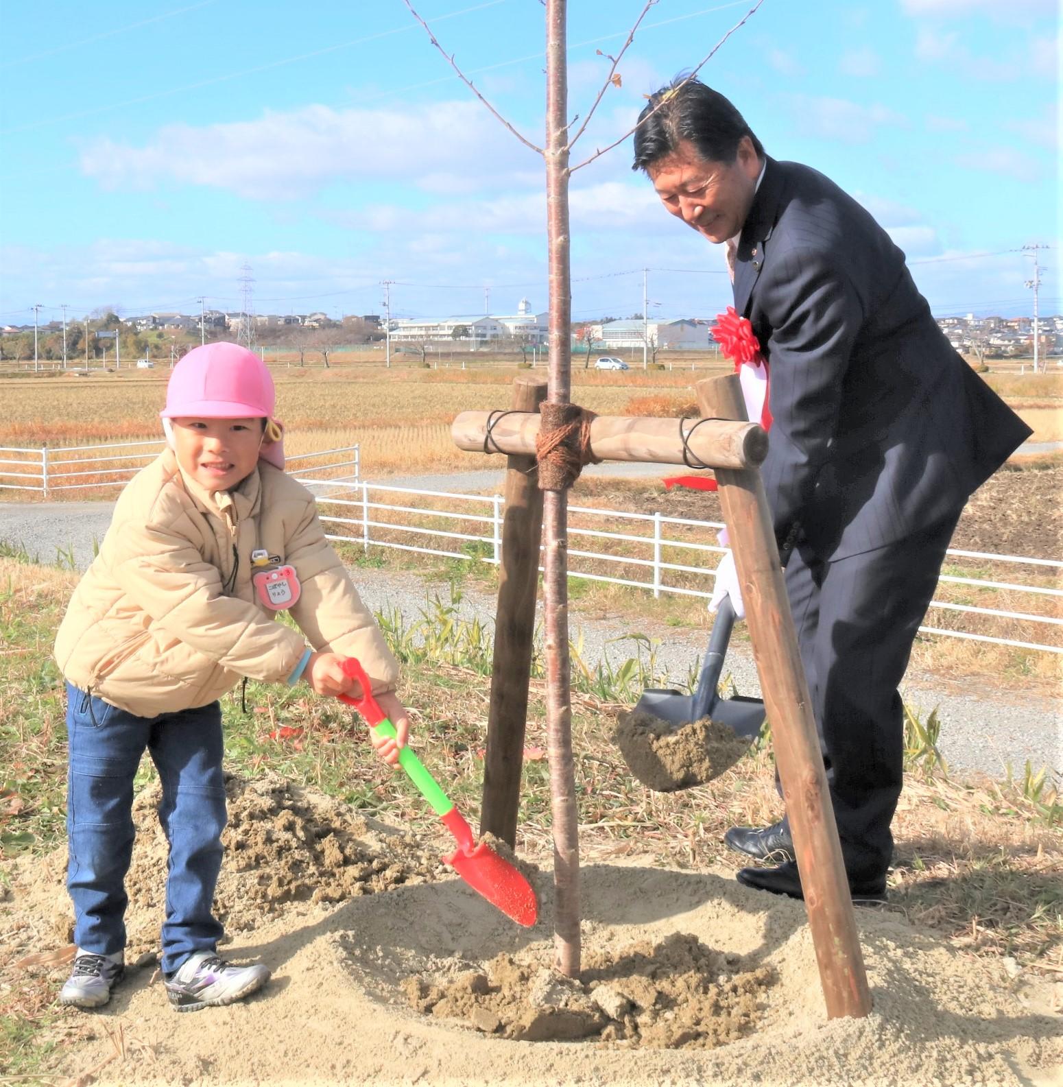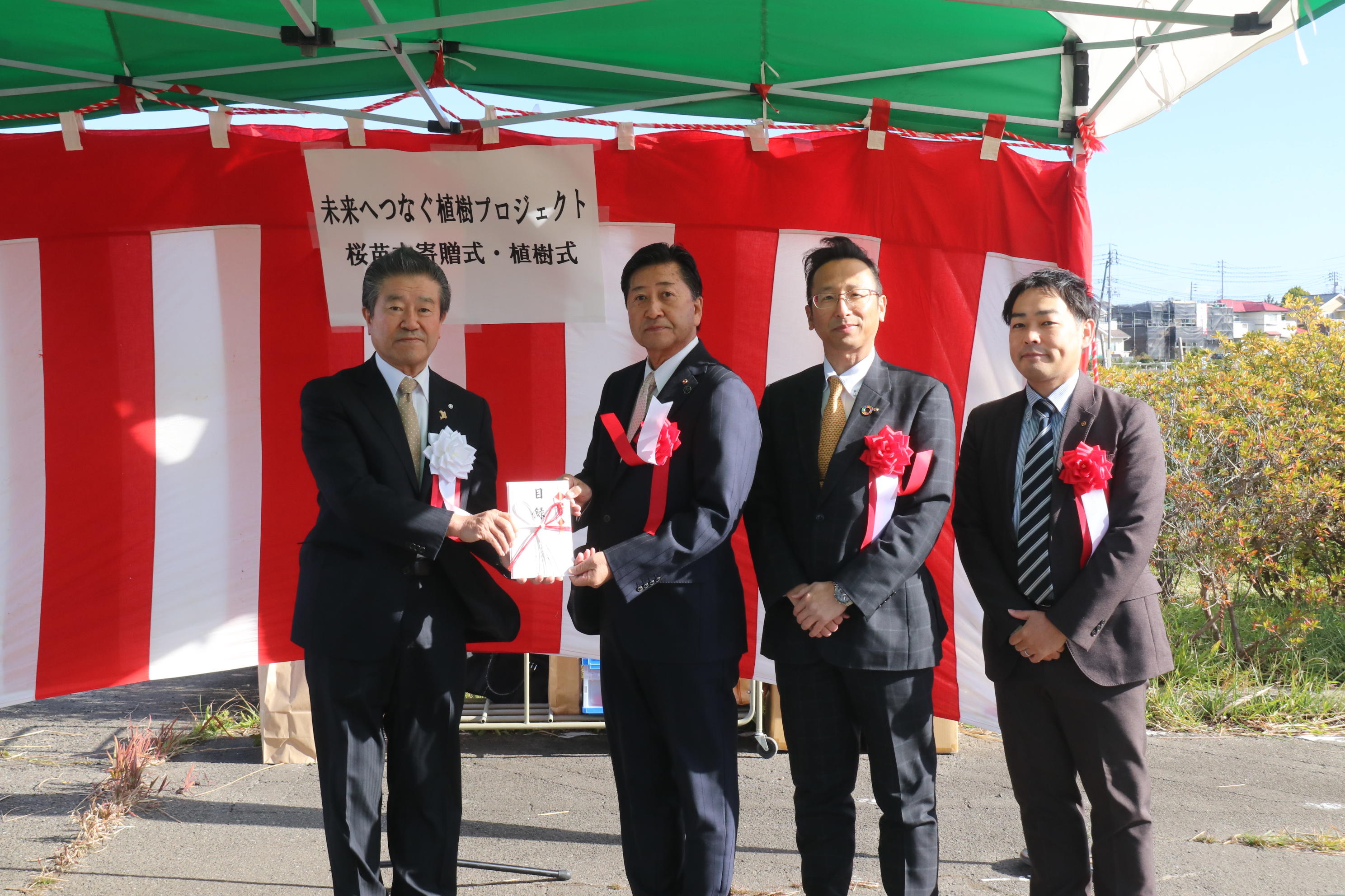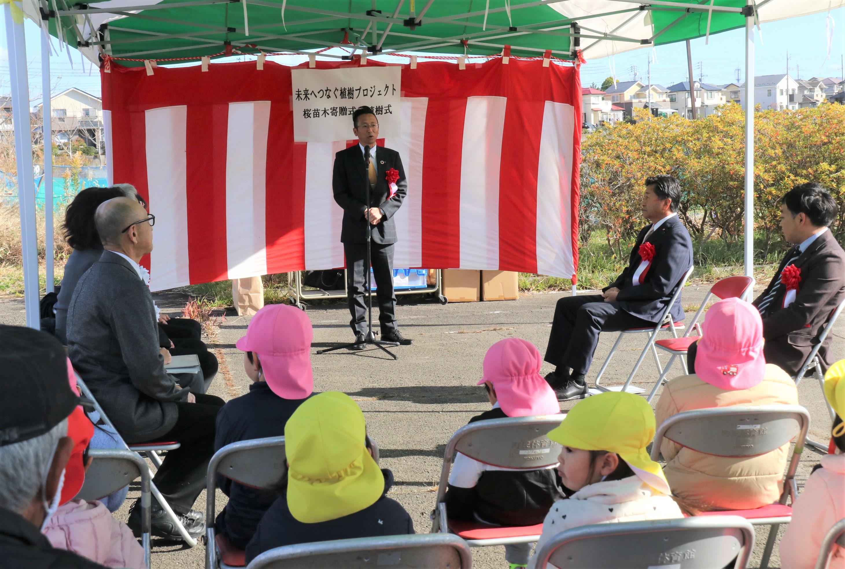 令和7年11月29日に東北ドック鉄工株式会社と株式会社七十七銀行塩釜支店兼北浜支店から、ソメイヨシノの苗木を寄贈いただき、海遊ほのぼの農園で「未来へつなぐ植樹プロジェクト」桜苗木寄贈式と植樹式が行われました。