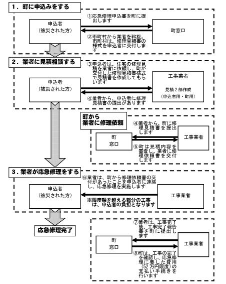 「東日本大震災」により「全壊・大規模半壊又は半壊した住宅」を市町村が業者に依頼して一定の範囲内で応急修理する制度です。