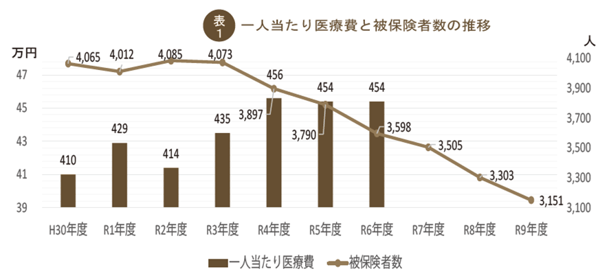 近年、町の国保財政は、被保険者数の減少により税収が減少し、そこに高齢化による医療費の増加も加わり、より深刻化しています。この状況は本町に限ったことではなく、全国的な課題でもあります。