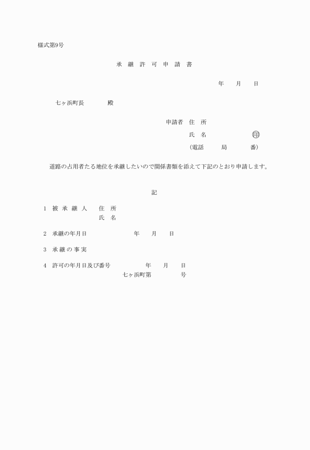 第9条 相続又は法人の合併により占用者等たる地位を承継しようとする者は、すみやかに承継許可申請書(様式第9号)にその事実を証する書類を添えて、町長に提出しなければならない。