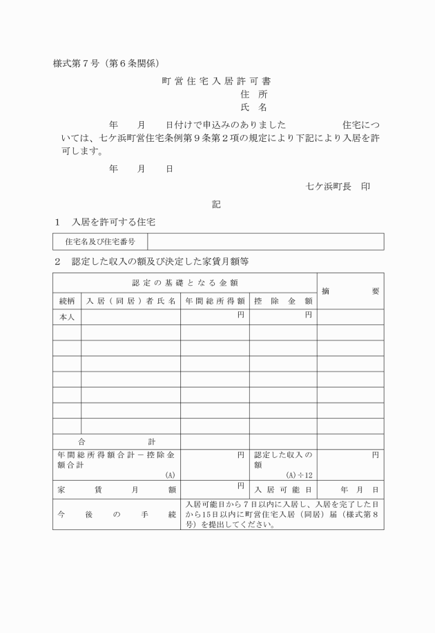 第7条 条例第9条第2項の規定により入居を許可された者又は条例第11条第1項の規定により同居の承認を受けた者が町営住宅に入居したときは、入居した日から15日以内に町営住宅入居(同居)(様式第8号)に入居した者又は同居した者の住民票の写しを添えて町長に提出しなければならない。