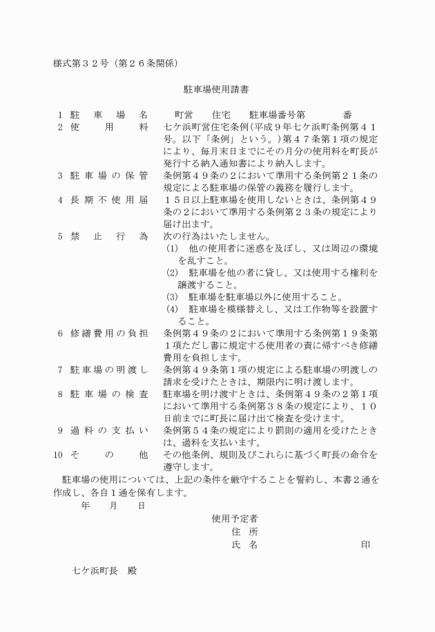 第29条 条例第46条の3の規定による承認(以下この条において単に「承認」という。)を受けようとする者は、駐車場使用承継承認申請書(様式第35号)に請書を添えて町長に提出しなければならない。