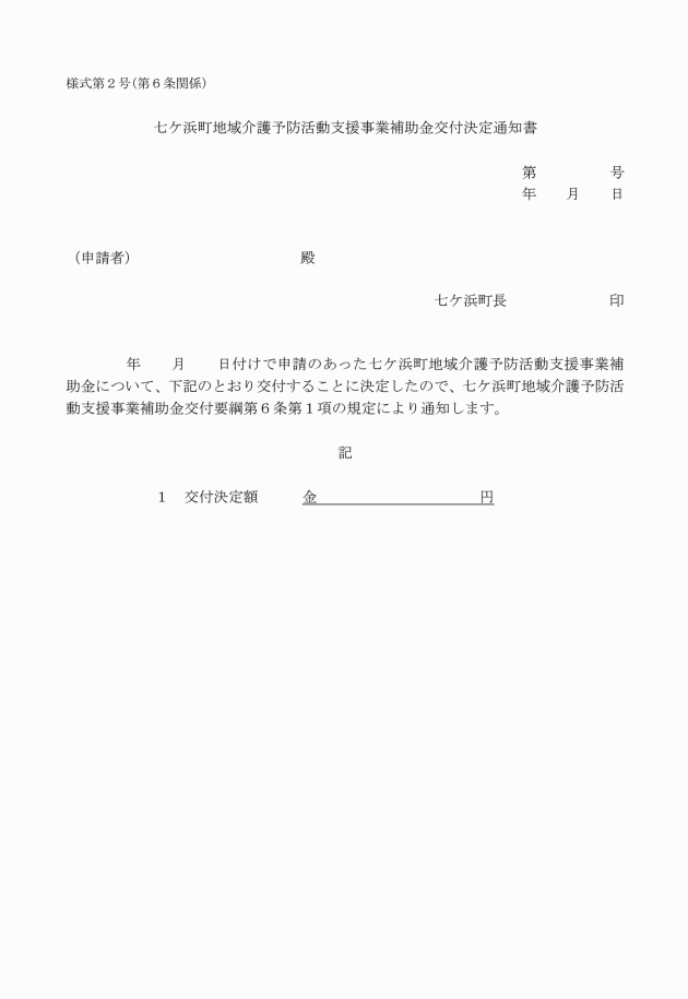 第5条 補助金の交付を受けようとする者(以下「申請者」という。)は、七ケ浜町地域介護予防活動支援事業補助金交付申請書(様式第1号)に次に掲げる書類を添えて、町長に申請しなければならない。