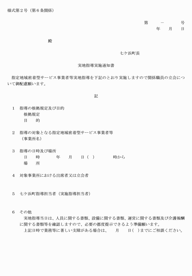 ア 実施通知 実地指導を行う指定地域密着型サービス事業者等を決定したときは、あらかじめ次に掲げる事項を実地指導実施通知書(様式第2号)により当該指定地域密着型サービス事業者等に通知するものとする。