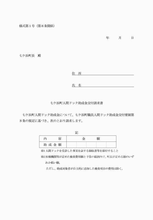 第8条 受診承認者が助成金の交付を受けようとするときは、人間ドックの費用、実施医療機関等名、人間ドックを受診した職員の氏名及び人間ドックであることが明記され、実施医療機関等の受領印が押印された領収書等を添付して総務課へ七ケ浜町人間ドック助成金交付請求書(様式第1号)により申請するものとする。