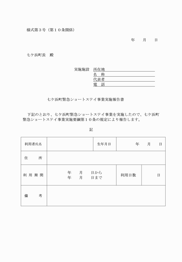 第10条 実施施設の長は、利用者に対して事業を実施した時は、七ケ浜町緊急ショートスティ事業実施報告書(様式第3号)を当該事業を実施した月の翌月10日までに、町長に提出するものとする。