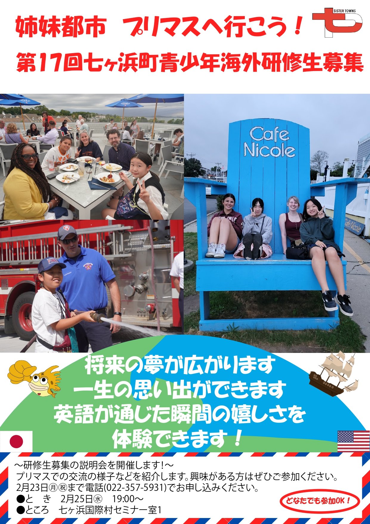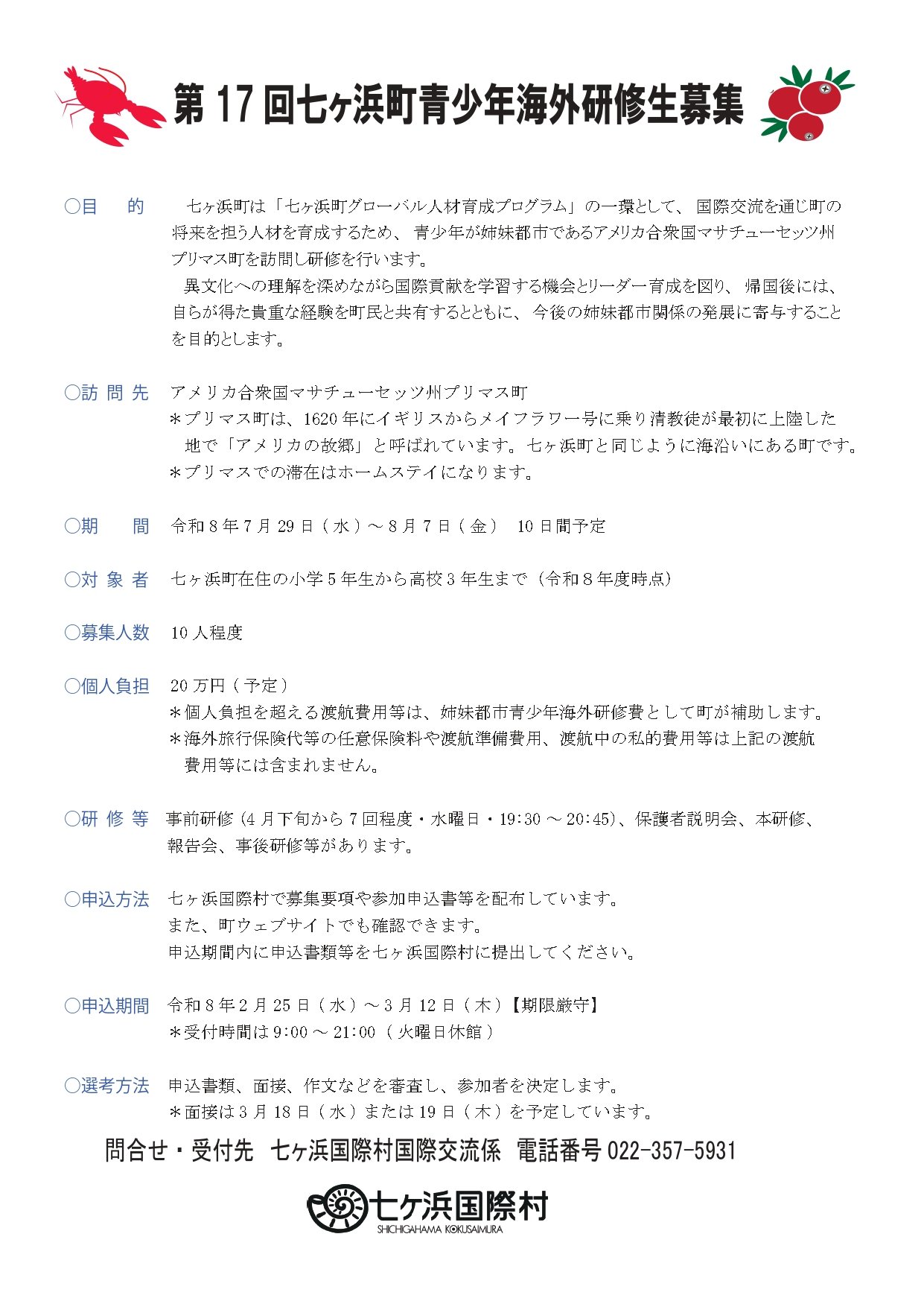 第17回(令和8年度)七ヶ浜町青少年海外研修生募集! [掲載日:2026年2月1日]