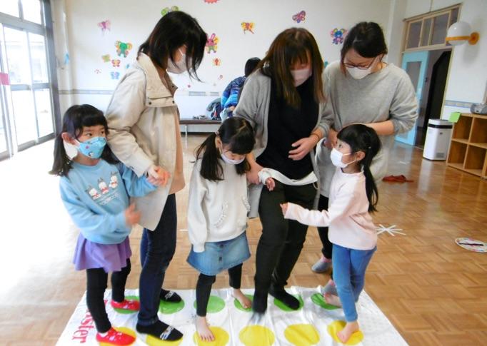 - お母さんと力を合わせて、ツイスターゲームに挑戦しました。