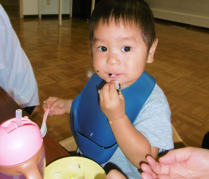 - 顔中ごはんつぶだらけになり、