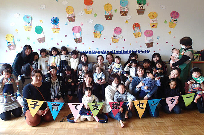 - 親子で気球を作りました。それぞれ個性豊かな気球が完成。早速ホールの壁面に飾り、みんなで記念撮影。