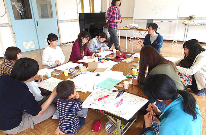 - 土8組の親子が参加し、子ども達は託児。ママは子どもから離れ、自分が子どもだった頃のあそび環境の振返り。あそびは変わった???改めて気付いたママ達。本来大切な子どもの環境とは・・・。