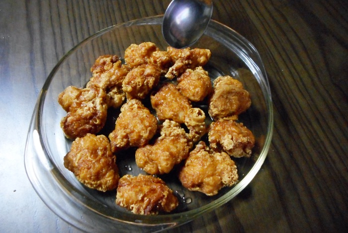 - 唐揚げを耐熱皿に並べ、3をかけて電子レンジ600Wで2分~2分30秒温める。