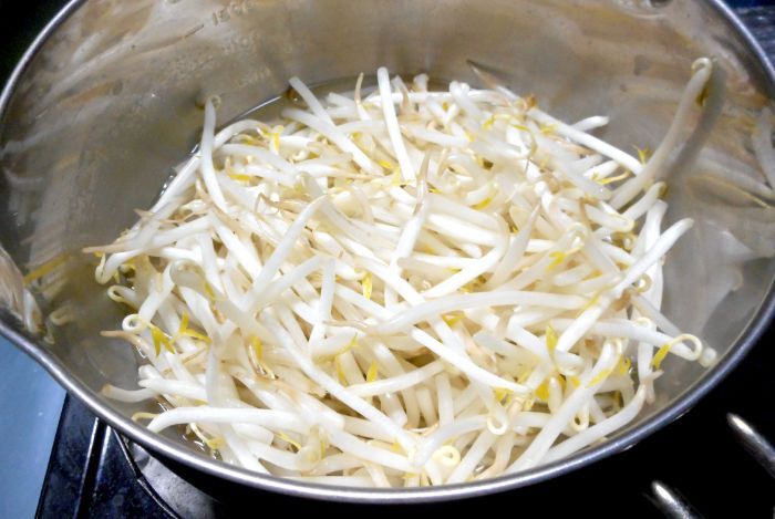 - なべにだし汁を入れて火にかけ、煮立ったらもやしを加え、ふたをして4~5分煮る。